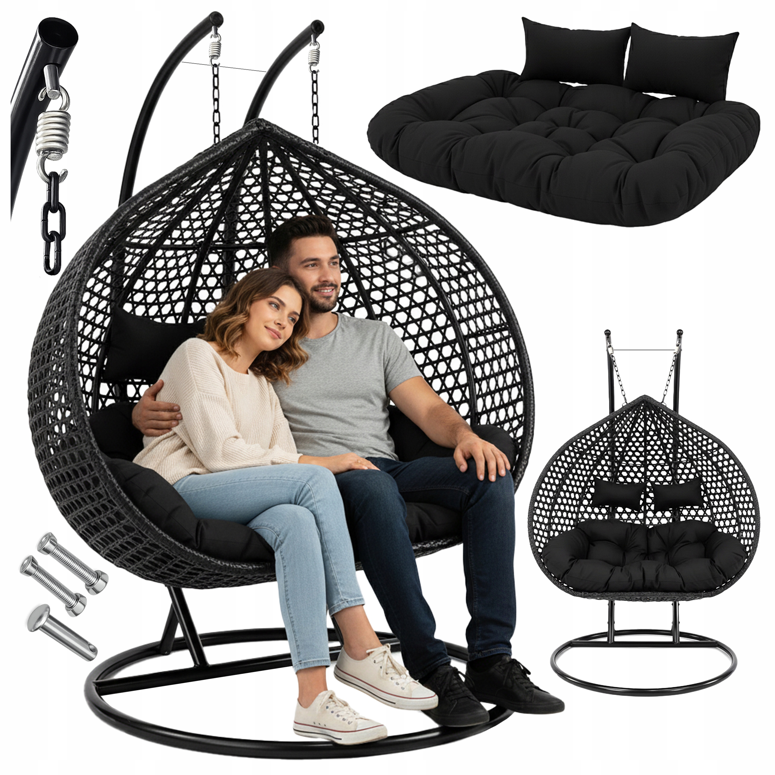 FOTEL WISZĄCY KOKON OGRODOWY DWUOSOBOWY DUŻY BUJANY HUŚTAWKA KOSZ DO OGRODU Kolor czarny